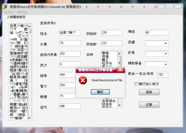 我是新手,刚开始学习咋修改MOD。从论坛下载的修改器,点了原版曹操传里面的data.e5,结果看的下面附件的图!高手来教下啊,谢谢!