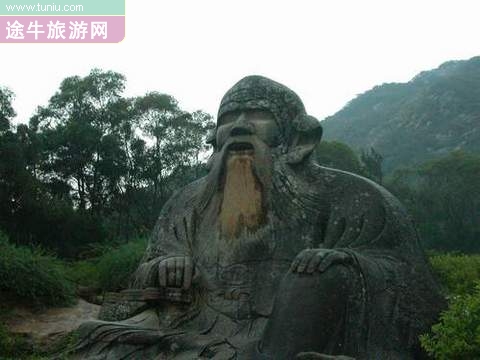 老君岩造像位于泉州丰泽区清源山西峰的罗山、武山之麓的老君岩上。旧志记载为宋时物,系由一大整块天然的花岗岩石雕琢而成。石像高5.63米,宽8.0l米,厚6.85米。老君身披道袍席地而坐,左足上屈作蹲状,右足前伸平放屈至前身,左手依膝平放,右手凭几, 食指与小指微前倾,似能弹物,面额丰润圆亮,两眼深邃,双耳垂肩,脸含笑容,长髯飘动,整座雕像极具神韵,是我国现存最高大的老子石刻造像,堪称宋代石雕艺术的代表作之一。