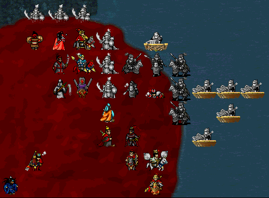 阶段二: 全军上移, 在右上角和与7阵敌人战斗, 3阵9阵及部分8阵敌人从后面追击, 派三个人挡住后面即可. 一路推到7阵门口, 可以顺便把7阵的单挑也完成. 然后前方一边对付1阵过来的敌人一边推进, 后面三个人一边挡住3,7,8,9阵敌人.一边跟着大部队前进, 河图外面只有三格,压力非常小.