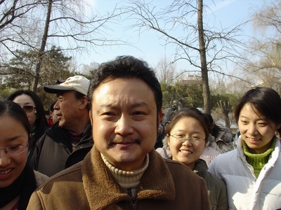 一夜北风紧,开门没雪飘。7号早上8:30,我骑个破车穿着那件极其醒目的蓝羽绒服哆哆嗦嗦冲到三环,在和同学汇合后倒了n次车来到大观园,而另外那位我高中同学的大学同学已经买好票在等了。说好活动是10:30开始,可快到11点还不见有人来。眼看人越聚越多,我掏出了记者证,与拿数码相机的同学一人一个,于是大门口最有利的地形被我们占了两席。