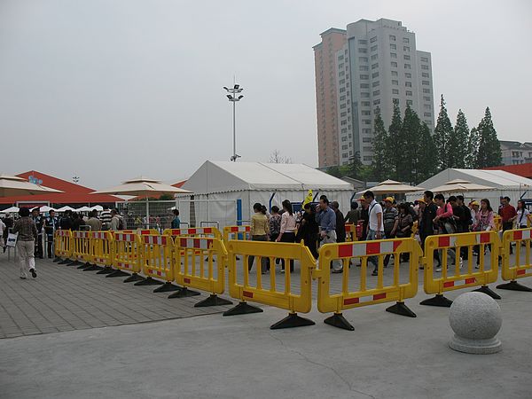 扔掉这些东西,为了你能更快的通过安检,安检的规格是机场登机的的规格。你在出示门票之后可以进入蓄检区,蓄检区是一个白色栏杆的折返蛇形通道,我们8点40样子到,蓄检区基本已经排满了,我们排在了最后。排队、折返蛇形通道,这是世博会最常见的故事。