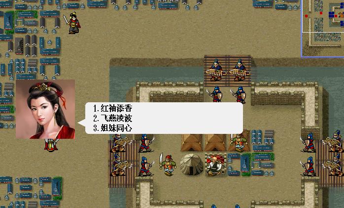 3:姐妹同心 作用说明:李红袖武力+2 宋甜儿防御力+2 HP+2 苏蓉蓉可选择兵种+1 且当前MP恢复至满