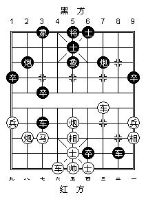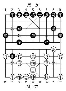 实战走了几个回合后的局势,黑炮正捉红车,照常理该逃车.不料红炮四退五,黑不敢吃车否则重炮杀!