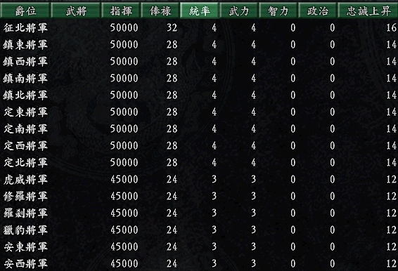猛将这么多却不能分配到一个将军位 感觉对不起这些历史名将啊 所以我对爵位做了下修改...希望广翔公在今后的版本中能考虑到这个问题...下面是鄙人自己乱改的 -.- 喜欢的朋友可以试试