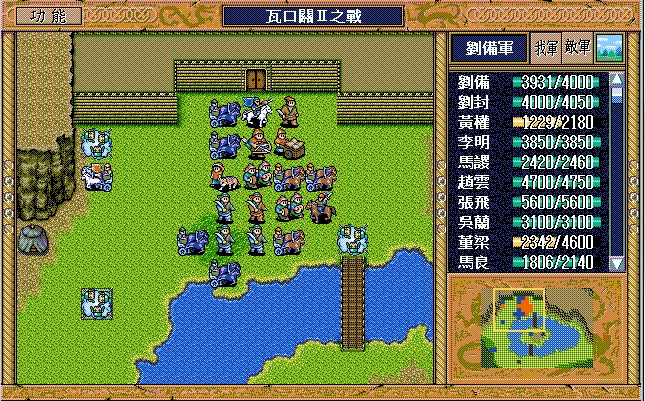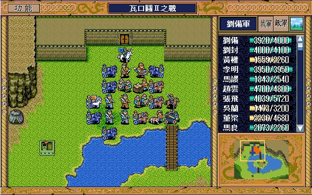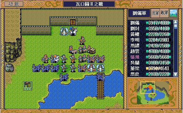 本战马良不上换赵云上,空出的卢马给孙乾用,可以加快撤往城内的速度。赵何、吴兰由于没有9X经验值,只能各少用一次策略。参考原来的董梁,前半程基本三点、后半程基本四点反击,赵何在少8点的情况下想要登顶,至少还要多反击16次,压力不小。思路有两条,一是“提升前半程为四点反击”,而原来董梁基本是从14回合开始的四点反击,即使之前每回合的反击都增加一次(其实无法实现),也达不到赵何登顶的目的;那么就剩“提升后半程为五点反击”这一条思路了,所以必须把张鲁利用起来,倒不用担心他兵力低了会援助自己,由于手持青釭剑(外加吴子兵法),攻击力比马超都高,即使受过一次牵制、即使兵力只有十位数、即使面对95级以上的傻瓜赵何,他都会毫不犹豫地选择攻击,因此对他的援助也格外重要。两个斜攻部队(张鲁、阎圃)加三个骑兵组成的方阵,似曾相识的感觉,没错长沙就是这么玩的。贼兵在考虑反击的同时还要兼顾自身策略值、防御力及总兵力,董梁纵有70多级,显然也吞不下这口硬菜,那么不是赵何也得是赵何上了。尽管赵何碰上张鲁时已经94级,兵力超过4500,但仍是如履薄冰,当有骑兵撤退时,还得趁阎圃使用援助才能补位,否则也扛不下来。鉴于傻瓜赵何的攻击力比董梁高了近200,光靠原来那两个步兵的援助是肯定不够的,况且也够不到张鲁,于是就要把以前没怎么派用场的弓兵好好利用。本战只有30回合,前期不能在城门口恋战,解决了几个堵路的敌军后(其中还包括骑兵2,赵何又少得5点),大部队需迅速向张鲁靠拢,得以尽快实现五点反击。难点一是张鲁附近的道路不像长沙那么宽敞,还有弓兵挡路,不利于尽快成阵,因此需有人从上路绕过去,先稳住弓兵,策略值、防御力、移动力俱佳的赵云便是不二人选;即便下路军少了赵云,到达张鲁附近时仍显得拥挤,因此8、9回合不得不让张飞放弃靠马谡的机会,提前插入敌军中枢,为大部队赢得了时间及走位条件。难点二是虽然增加了三个弓兵给敌军提供后勤保障,但增加了一个反击点后兵力还是堪忧的,因此防御力较高的马岱就不能早撤退,必须坚持到底,阎圃的援助也主要集中在后期,另外马超的几次激励也至关重要,否则敌军一是撑不下来的,二是马岱由于从开始反击到结束,士气一定会低于40,激励他就会影响反击量,三是阎圃的士气对于使用援助或是攻击的选择很微妙。另外7回合开始两个步兵的援助对象、时机、站位也有讲究,除了要打不到赵何,还要尽量避免S/L的难点。