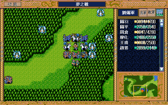 敌 许褚开始原地挑拨(失败,直至策略用尽就休息),张郃继续攻击藩宫,弓兵3下方三格攻击黄权,武术家(清醒)左开始攻击刘辟,骑兵3原地挑拨刘备,运输队右一大救济。
