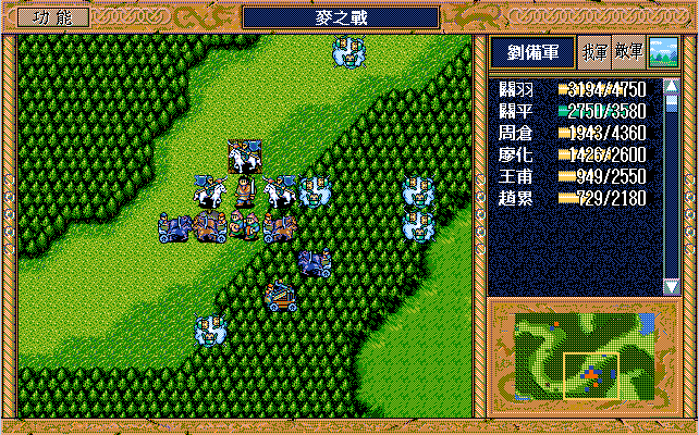 我 吴兰右一援助、黄权上激励吴兰,刘备下假情报骑兵2,马良左下补给刘辟,刘辟牵制弓兵6,糜竺进村庄激励陈式(从此不变位置),陈式上攻击步兵5,马谡上激励藩宫,庞统下一,藩宫右一上二大焦热(失败),刘封右援助藩宫,王平右援助陈式;