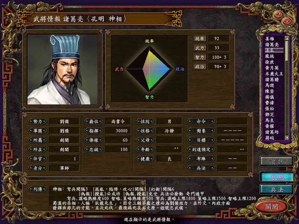 3、 曹操和孙策没有势力兵法, 这样电脑才有可能按照名将特长来给他们配备兵法, 而刘焉的部队因为比较面又没啥名将所以给了他象兵作为势力兵法.