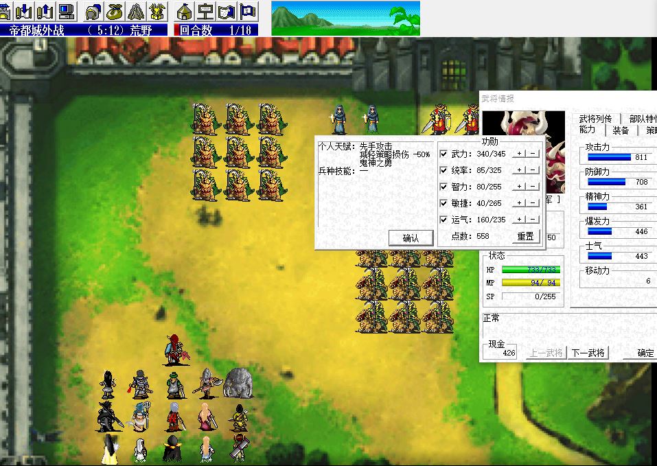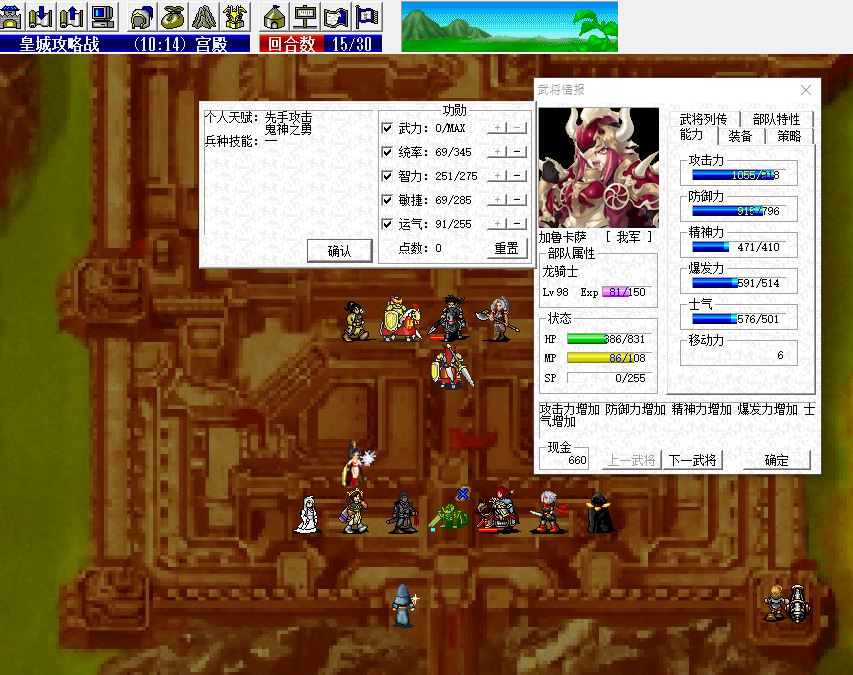 更新后打完了,这次有功勋系统很赞,人物可以“完美培养”了。不过发现一個大问题,就是帝都城外战战前准备转了职的主角个人天赋明明有减轻策略50%,入关后任何一行动后选择是否发动梅姐和帕梅拉特技后那个天赋消失了,而且是永远消失,选哪个都会如此。其他的沒啥大問題。期待樓主下次更新。