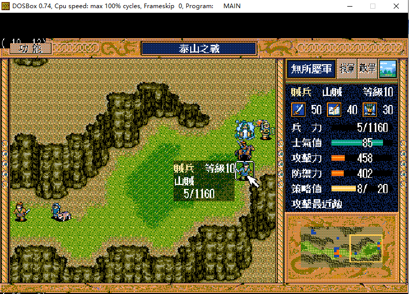 4.左上村楼主是让10贼进去,我试着用自己的档(张飞开场20级,比楼主开场21级,少一次策略),第28回合7贼进入左村,空1回合缺少一次牵制的情况下,可以坚持到第40回合,理论上用7贼代替10贼是可以的,实际中能否实现需要验证。