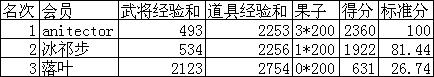 怎么参考呢?具体结合本次比赛来看,anitector和冰祁步分别是两轮比赛的前两名,各得了一次分轮的冠军。那前两轮的总排名谁靠前呢?表面上看第一轮anitector只赢了冰祁步2分,而第二轮冰祁步赢了anitector30分。但第一轮的2分意味着多省出来两个武将的行动,而第二轮的30分只是多得了30点经验而已。30点经验相当于什么呢?我们这样算一下:anitector在第二轮一共得了2572点经验,冰祁步的30点经验也就是多得了1.166%的经验值。而anitector在第一轮一共走了111步,冰祁步多走的两步就是多走了1.802%的步数。所以总体看前两轮,应该是anitector略强一点点。所以,以每轮的第一名为参照物,看其他会员按第一名的成绩完成的比例来评分。这样两轮比赛的评分就有可比性了。