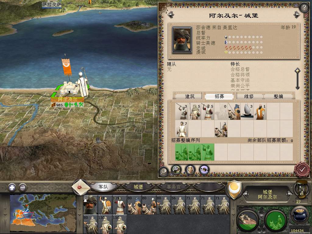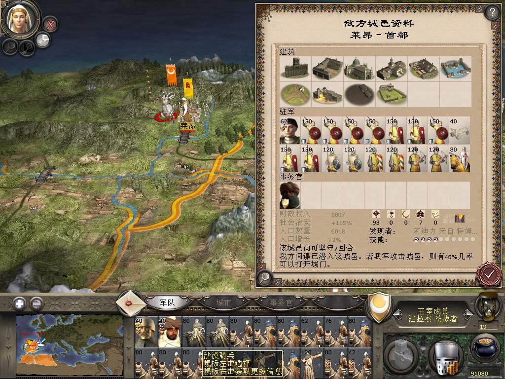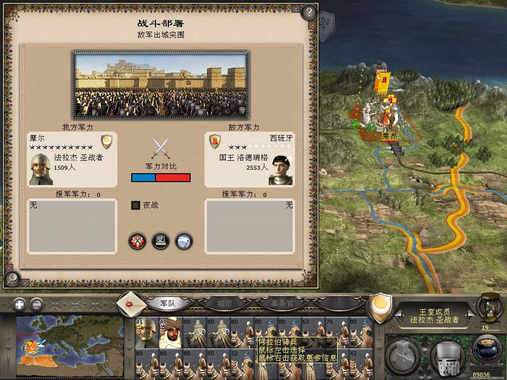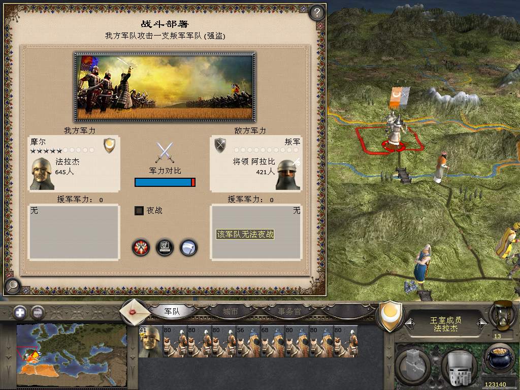 一天父亲找到了我。告诉我领地内出现的叛军,命令我亲自带兵前去消灭。我领着自己的卫队和父亲给的4支沙漠骑兵和啊拉伯骑兵上路了。以645人对421人的兵力开始了我的第一战