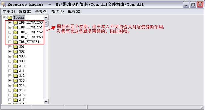 首先,请下载Resource Hacker工具,附件里的是汉化版。用这工具打开Tou.dll文件。展开资源,看到如图这样子: