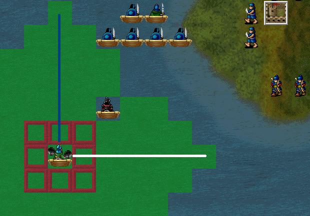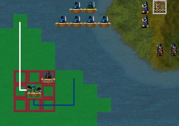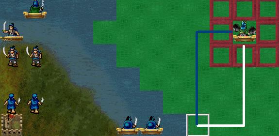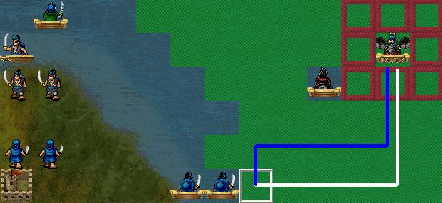 重点要说的是,当一次行动能够攻击到敌人时,“到指定点”的武将会先找出他沿着“逃至指定点”的路线一次行动应该走到的最远位置。