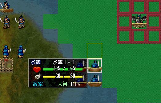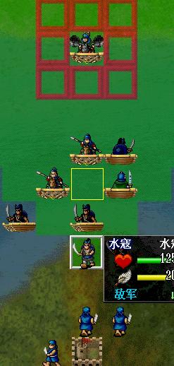 上图,由于吉青的挡路,行动路线改变。何元庆在白框减一格的黄框上可以攻击到敌人,所以,他会走到黄框攻击岳飞。