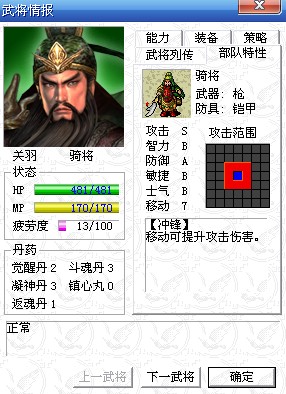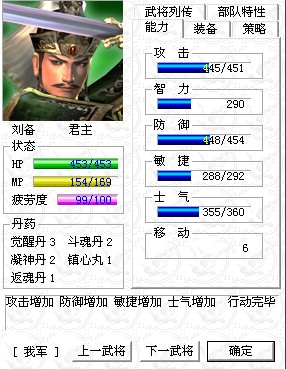 (p.s. 1、镇心丸在原功能基础上增加一个功能,我方是疲劳过高时可恢复疲劳,电脑带着则意义更大,每回合恢复的疲劳值=镇心丸数量;2、敌人也会携带丹药,例如虎牢关的吕布带有单挑的两丹和觉醒丹,打起来更不简单。还有,关于单挑秒杀,敌我都是在有单挑2丹其一时才能防秒杀,也就是说,即便敌人是无双武将,只要他没丹,一样有可能被秒)