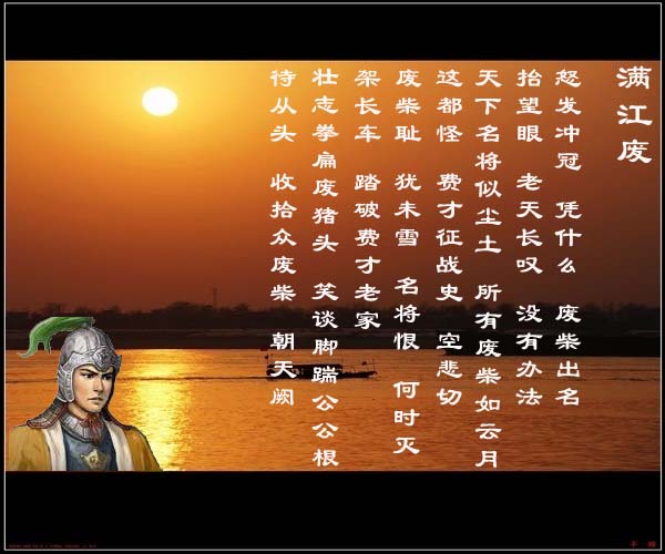 暗淡了刀光剑影,远去了鼓角铮鸣。眼前飞扬着一个个鲜活的面容。涅没了黄尘古道,荒芜了峰火边城,岁月啊你带不走那一串串熟悉的姓名。兴亡谁人定啊,盛衰岂无凭啊。一页风云散哪,变幻了时空。聚散皆是缘哪,离合总关情啊,担当生前事啊,何计生后评。长江有意化作泪,长江有情起歌声。历史的天空闪烁几颗星,人间一股英雄气,在驰骋纵横。