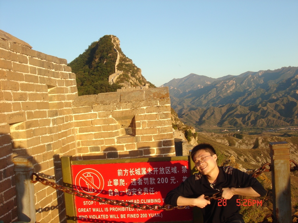 过了吊桥,司马台的十二座敌楼还有十座,在我们的视力所及,第七座最高,我们相约爬上最高的,等真到第7时明白其实一座比一座高,心都凉了,我桀骜的本性开始发作,一定要爬到最高的那座,一个家伙说他在这里等我们,因为我们上去还要原路下来,我们把一些不吃的东西留给他,继续前进,这里的几座都比较陡峭,天色又渐晚,山风吹得人心慌,腿早就在抖了,真的是在爬呀,可怜我手上的伤还没好,刚刚不小心又扎了一个刺,在九楼和十楼之间,一哥们说:不向上了,回去告诉下面那家伙,这就是最高的了。话还没完,刚才说不上来的那哥们就上来了,我们相视哈哈大笑,继续爬