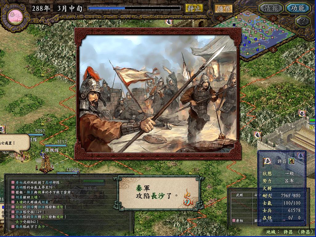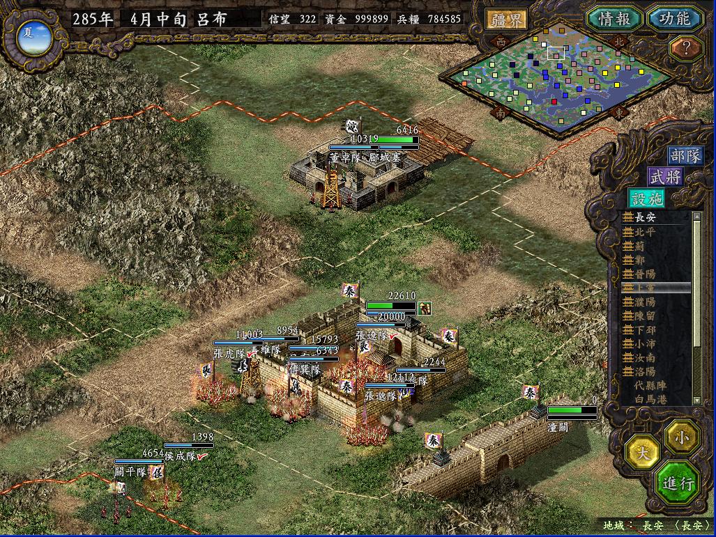 那个长安之战当时玩的时候,总是不由自主的想起汉中剧本那种三面夹攻的情景,如果敌军同时攻打我两个城,我就根本没办法从周围地方送援军过去(人手不够,守城都勉强凑合),而且守城的时候一个城最多留下7个将(两个城都在打,如果每个城8个将以上的话,另一边就没法守了),这样7个人还要有一个守城,6个人最多出两队,对付人家8,9队乃至十几队的攻城部队,实在是不好打。