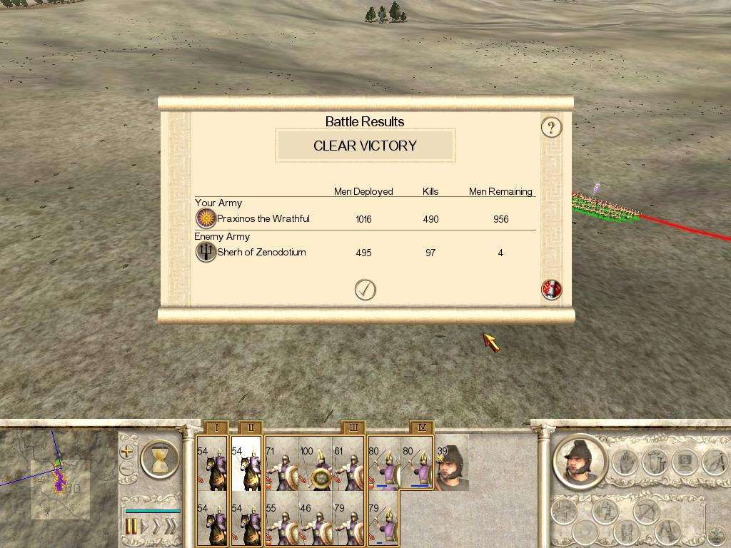 但是毕竟普拉克西诺斯军团拥有超过两倍以上的兵力优势,而且骑兵、步兵和弓矢步兵齐备,因此很快就以较小的代价歼灭了拦路的叛军,取得了完全的胜利