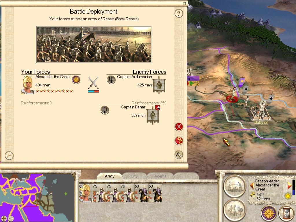 尽管普拉克西诺斯军团还在紧急赶来的路上,但是我军已经不能在白白等待下去了,因此亚历山大军团挑选出最精锐的3队重装步兵和2队轻骑兵,在已经达到6级经验的亚历山大卫队的带领下,冒险对巴比伦发动了一次攻击。由于巴比伦城外的叛军加上巴比伦城的守军,人数是亚历山大分队的两倍,因此两股敌军决定与我军进行野战