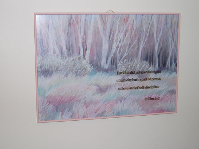 沿着机场高速(据说一旦战争就是飞机跑道)一直走到Stevens RD,出口不远就看到我住的旅馆。旅馆的名字叫Metropolitan,好像是“大都市”的意思吧,中文名字叫“京华”。尽管取了个大气的名字,房间里的条件实在是盛名难副,大概就和农大招待所的条件差不多吧。房间在4楼(最高就4层,晕死),窗外的楼下有个游泳池——可惜窗户打不开,不然我有跳下去的冲动,热。墙上挂着一幅油画,很简单但也很有韵味,上面的一句话好像是《圣经》里的。其实刚到这里就有点宗教的气味,旅馆隔壁就是基督教青年会,房间的抽屉里还端端正正的放了本《圣经》。