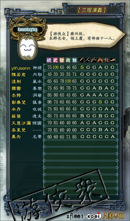 头像文件:San11face01.fce,复制到“我的文档\KOEI\San11 Tc\FaceData"下。