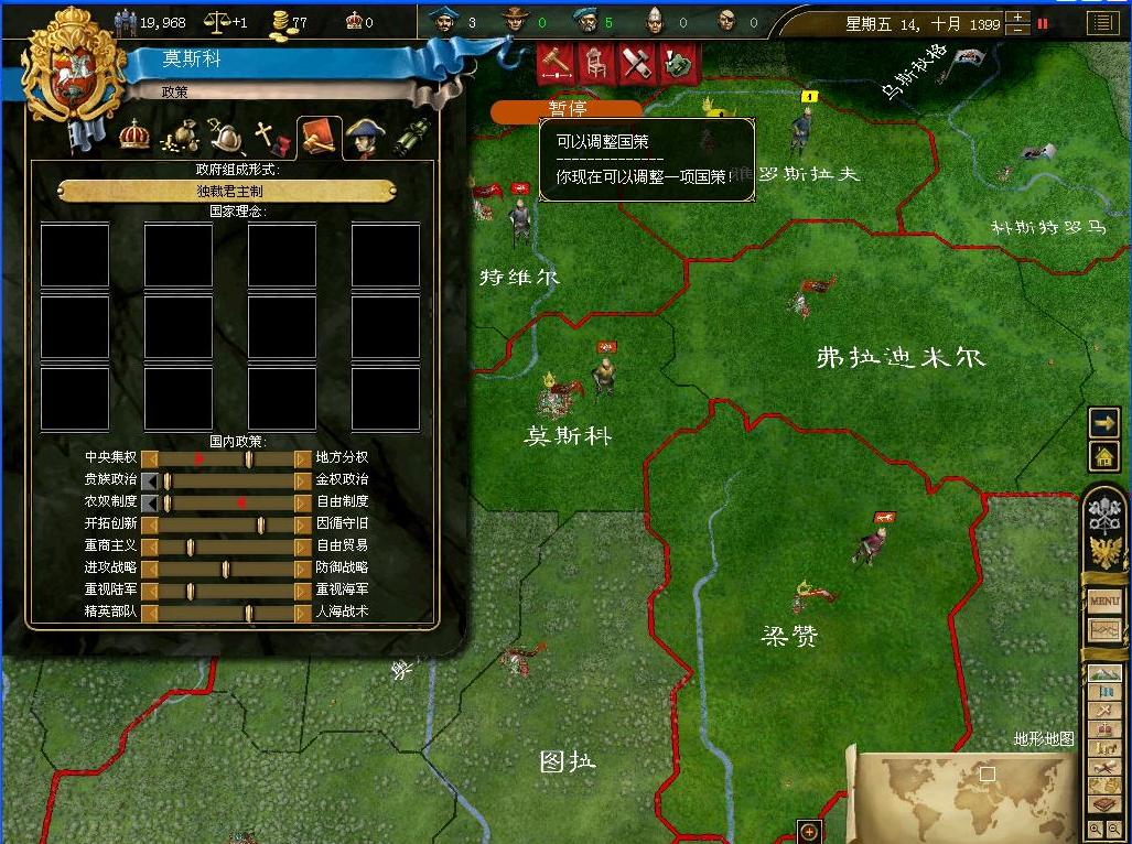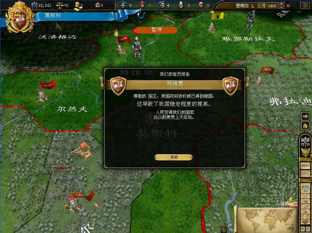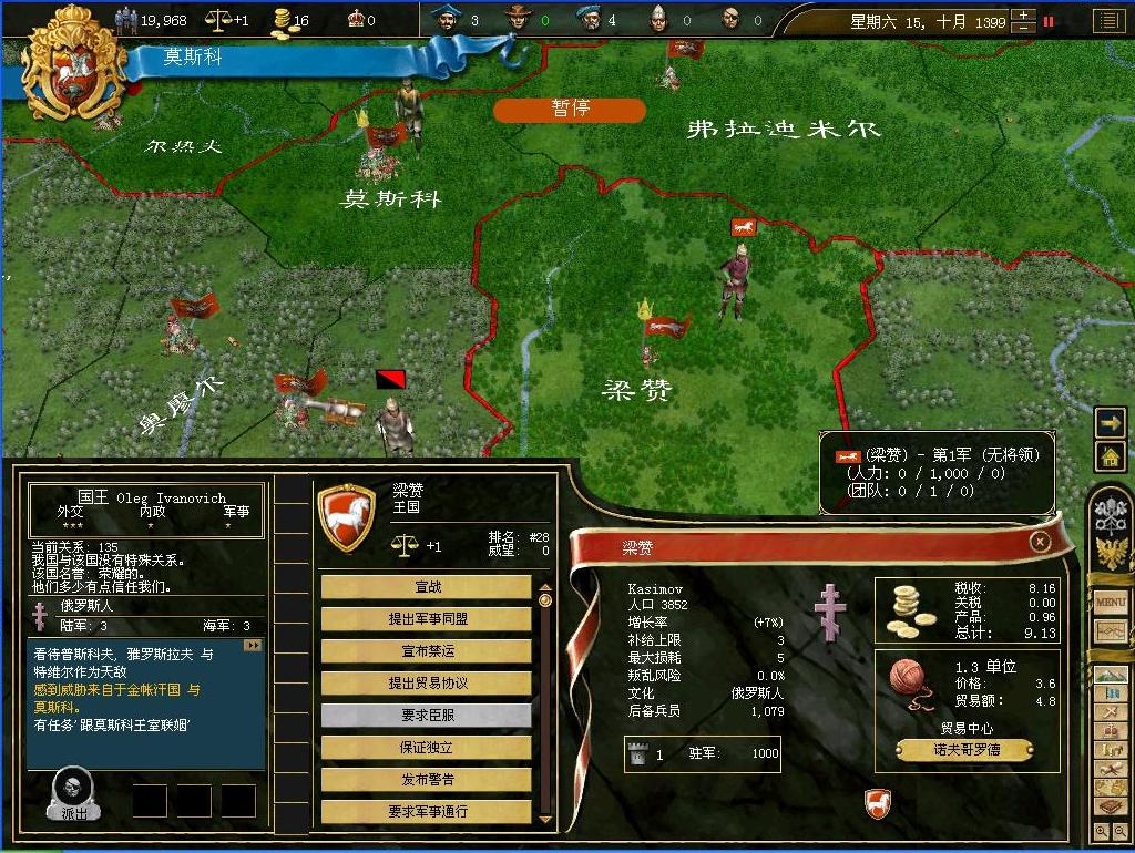 莫斯科是一个面积比较小的公国,仅仅只有7快土地.身边有3个更小一些的公国.同时,也存在着几个强大的公国,比如强大的金帐汗公国就是其中之一,而且儿莫斯科公国关系有些紧张