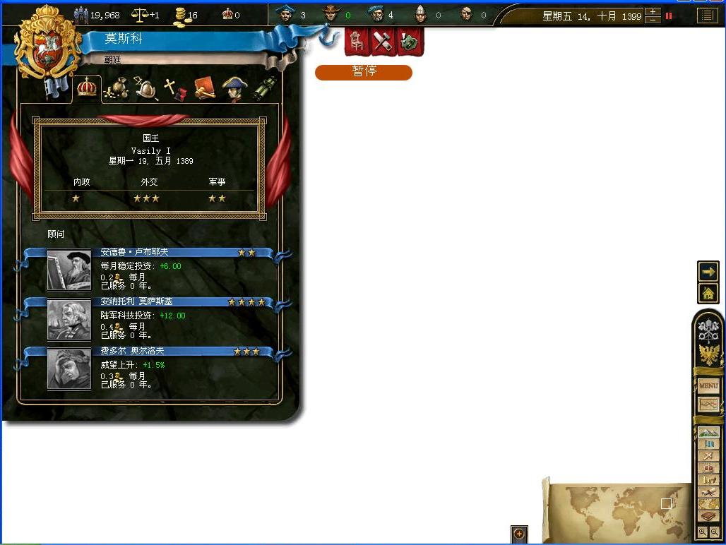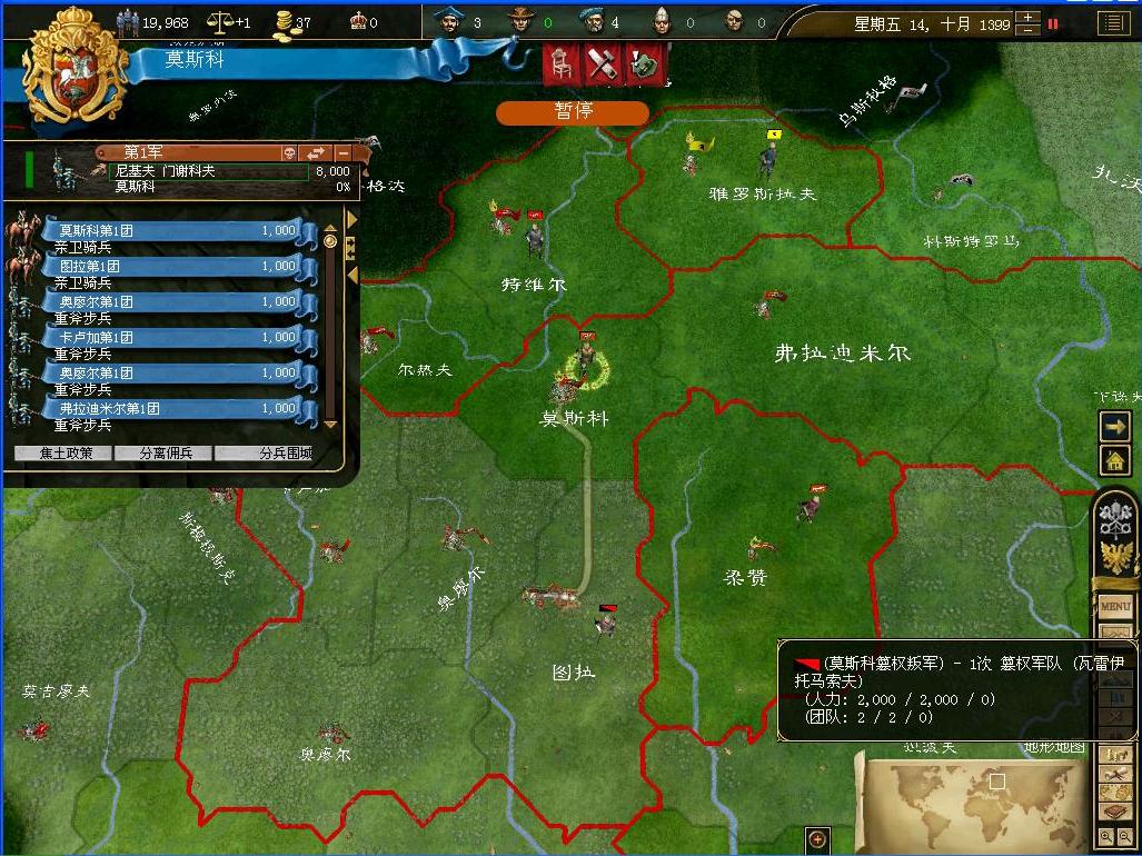 莫斯科的并非一个军事强国,所以军力也相对薄弱,仅有8000卫队的第1军也是莫斯科的唯一军力.其中仅有2000亲卫骑兵,兵力可谓赢弱.