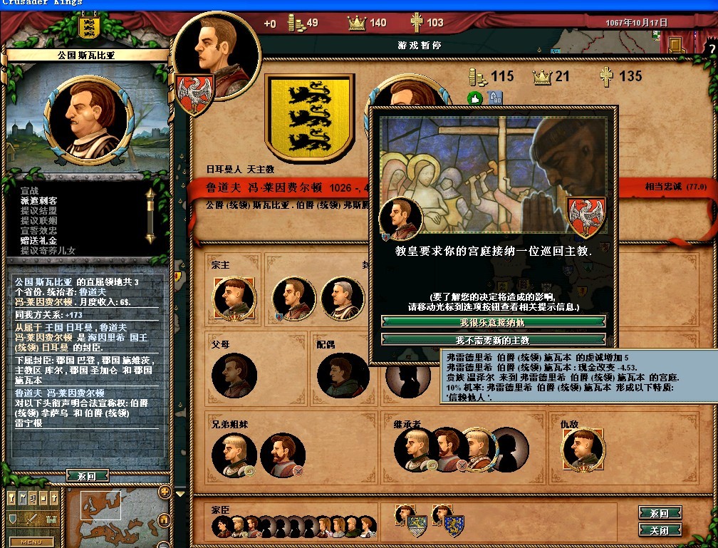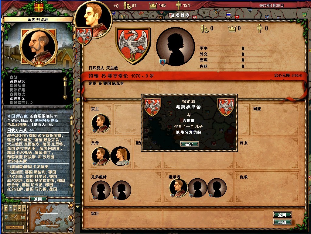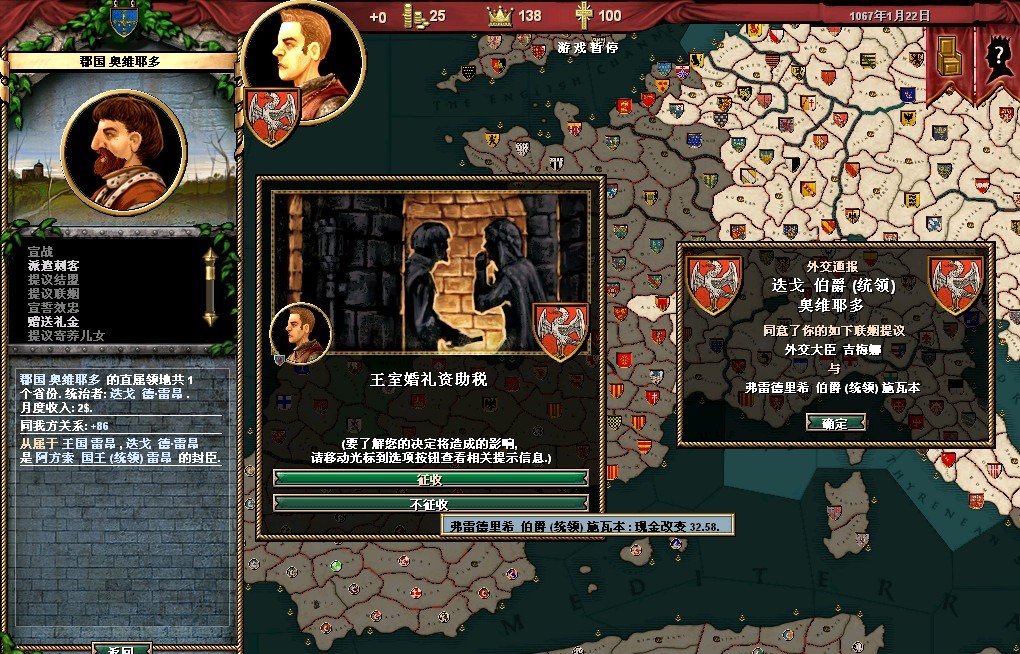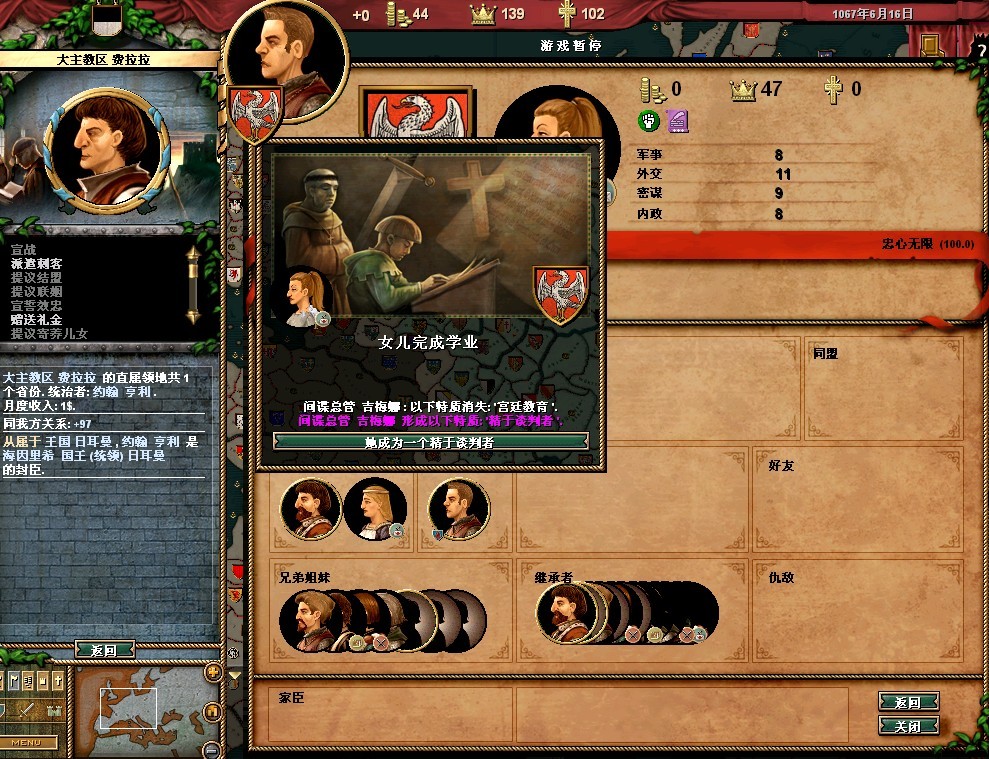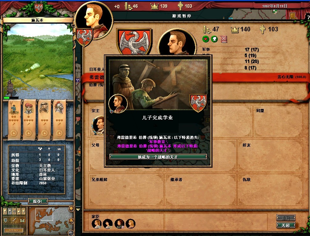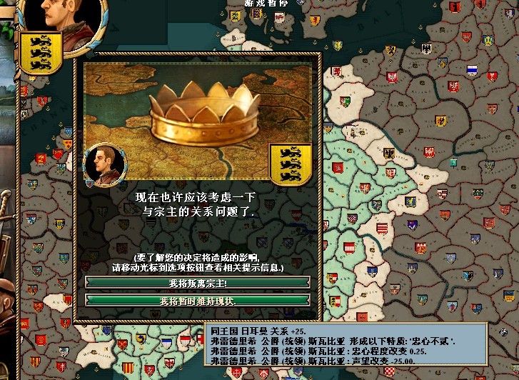 弗雷德里希的属性还可以,领地的收入很垃圾。把法律更改一下,目前我用的是血亲继承权,君权至上,以及王室成文法(目前没封臣,用这个法律军队强)