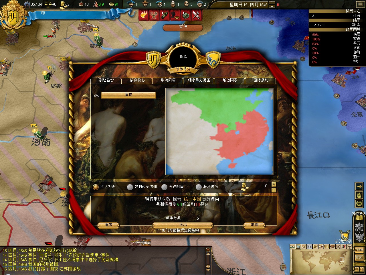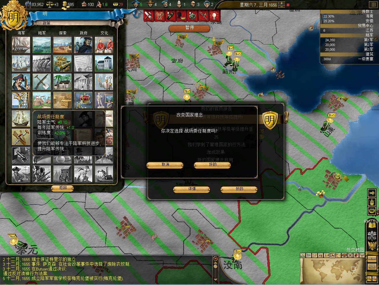 常例开局。话说三个南明剧本 1645 1652 1659,都相当BT。尤其是1659剧本,基本是不可能的任务嘛。1645剧本和1652剧本比较,1652剧本把张献忠的地吞了,兵略多些,还有个BT的李定国,但是1652剧本的南明有两个致命的弱点。一是东面被建奴占了一大片领土,这让我军无法迅速的以最小的代价来与建奴议和。二是江苏丢了,没有了江苏,经济上此消彼长,相当头痛。