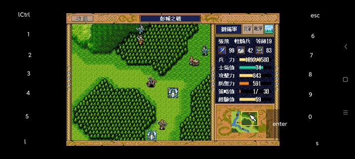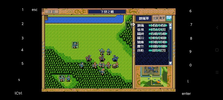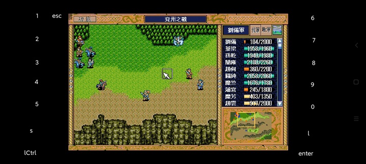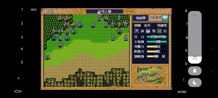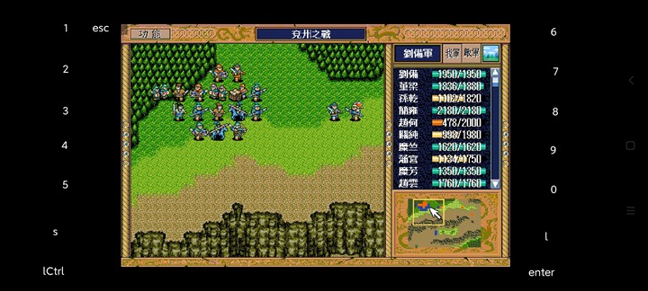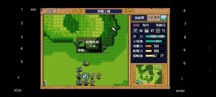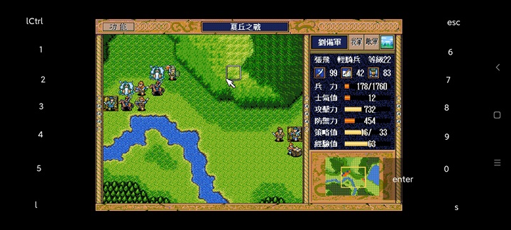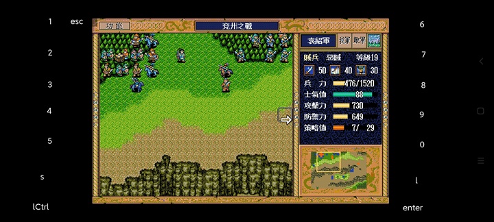 前两回合和全补丁打法一样,就是我是用简在最后带马,第一回合简把马给何,何给行动后的张,刘吃糜升级援助升级,纯再吃刘升级援助,第二回合要雨天,朱灵要攻击何。第三回合有些不同,我发现20贼丢假情报概率太高,我是这样站位的,让何吃了2火龙1牵制到士气70,大大提高了20贼攻击何的概率,最后20贼也成功援助了5次。