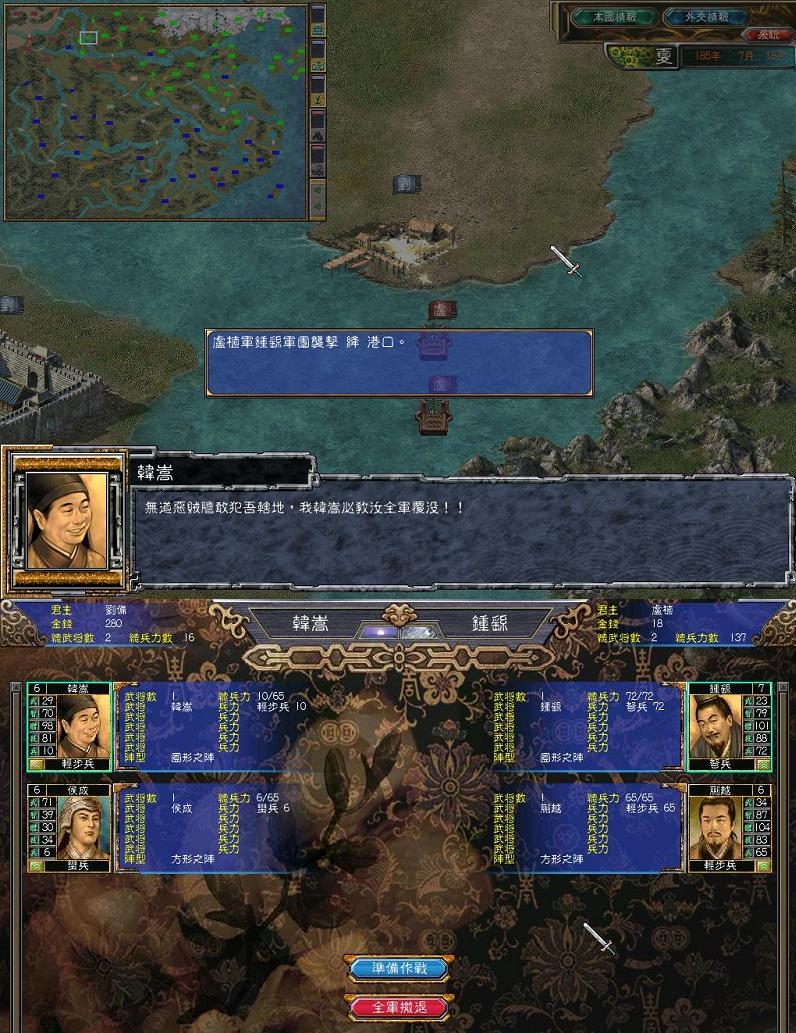 经过了N久的拉锯战,我方的港口降已经无险可守、无兵可派了,可在这时卢值军钟谣部队(何进被我俘虏)却又逼近了...
