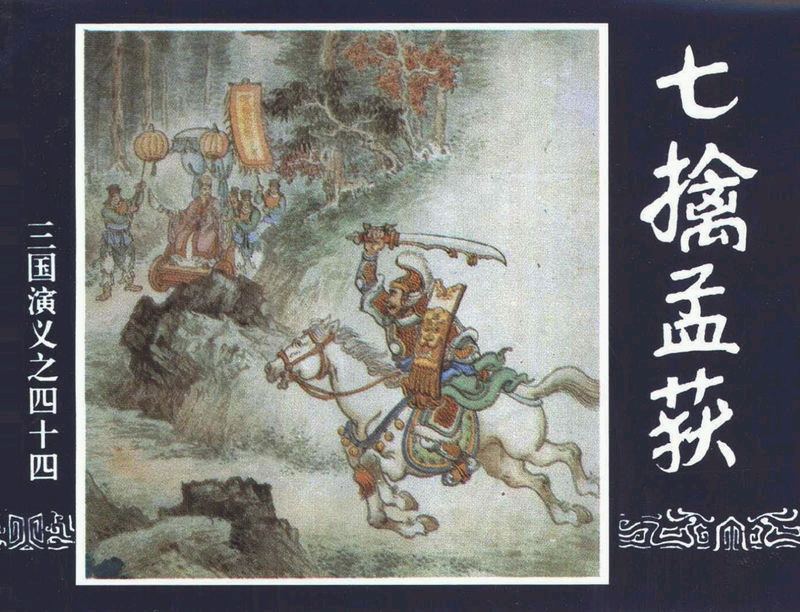 《三国演义》原著中的描述如下:“中间孟获出马:头顶嵌宝紫金冠,身披缨络红锦袍,腰系碾玉狮子带,脚穿鹰嘴抹绿靴,骑一匹卷毛赤兔马,悬两口松纹镶宝剑,”;“孔明见孟获身穿犀皮甲,头顶朱红盔,左手挽牌,右手执刀,骑赤毛牛,口中辱骂;手下万余洞丁,各舞刀牌,往来冲突。”