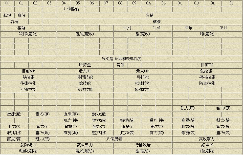 金钱地址往前84个字节是出生国,00是卡兹赫姆、01是罗玛尔、02是马尼卡帕、03是伊雷侬莫、04是巴拉克夏、05是伊塔尔、06是日倭、07是长唐,08是妖精国。出生国后面4个字节是出身地。