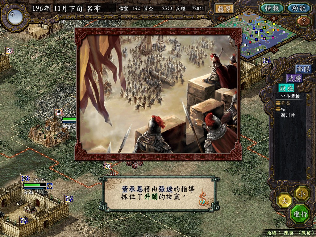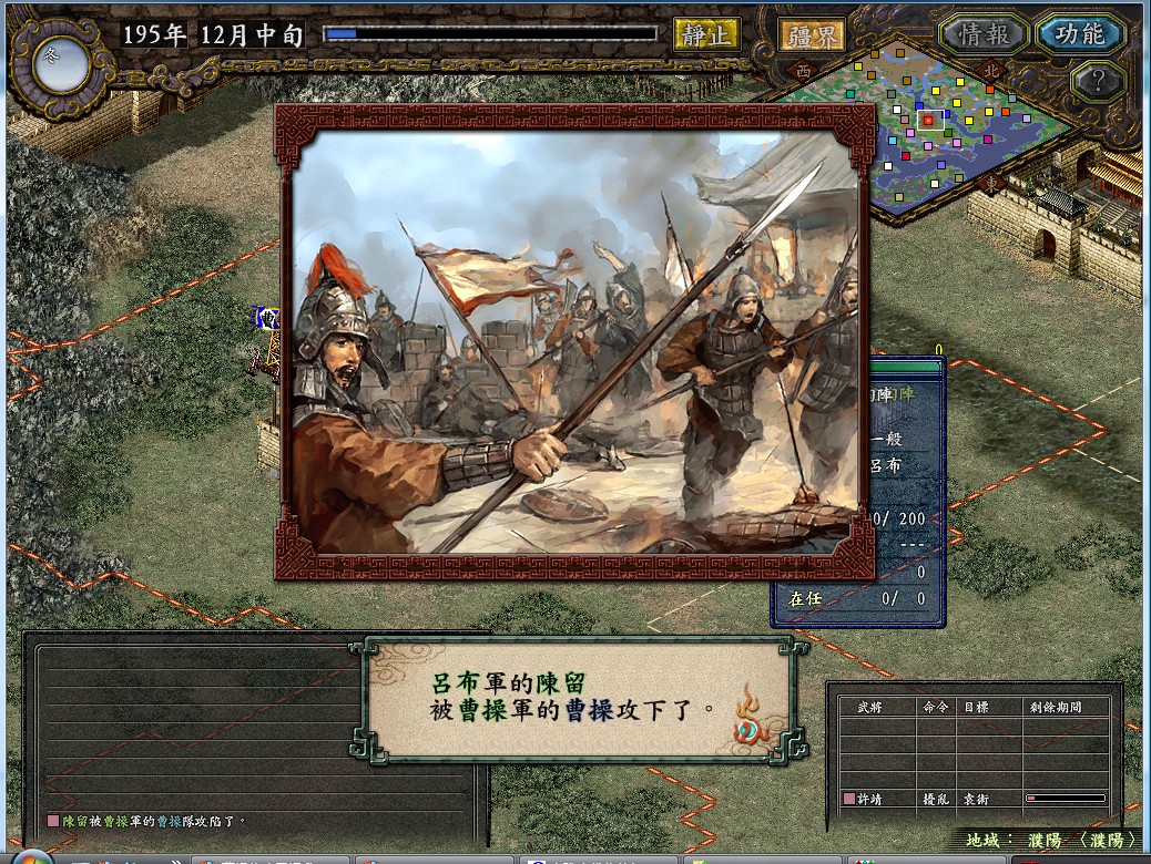 陈宫:恭喜温候入主陈留。曹操虽被压制在濮阳,但目前将领数是我军的三倍,士兵数是我军的两倍,钱粮无缺,想必他很快就要大举反扑陈留了,还请主公早做准备。