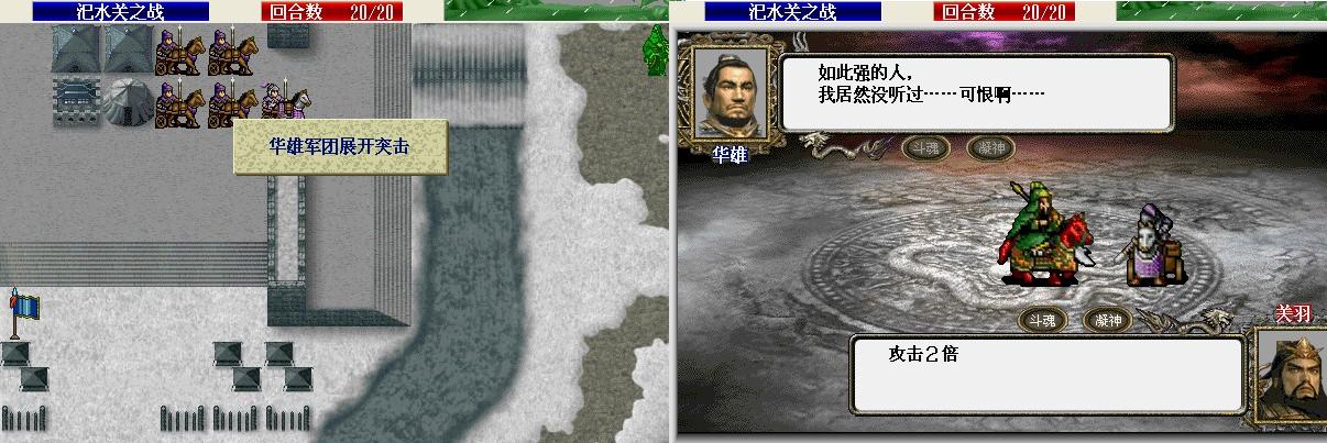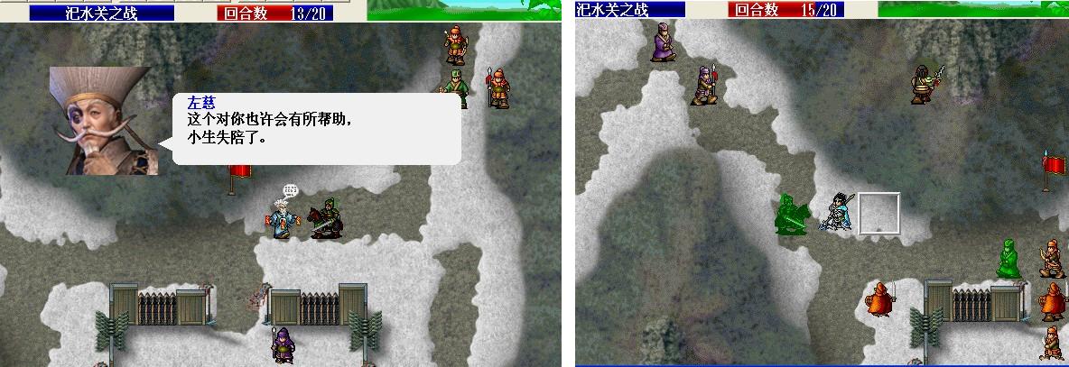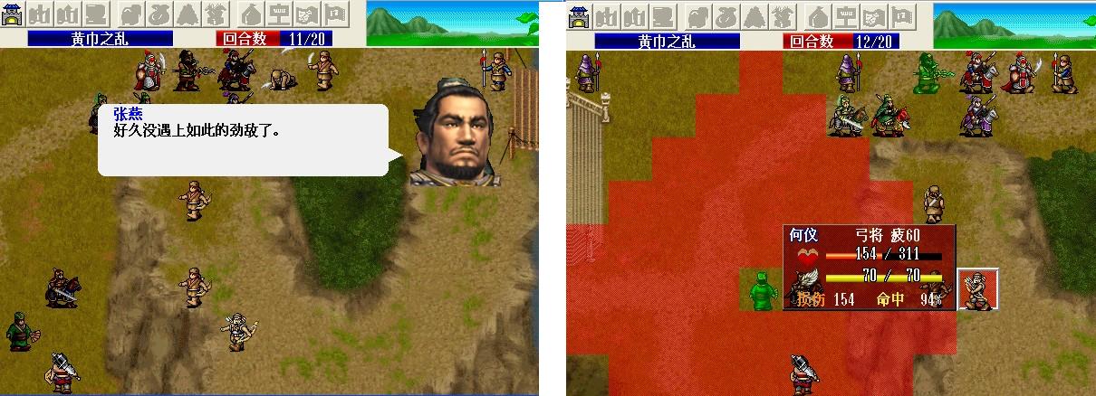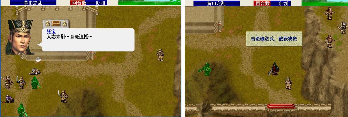 第一回合: 刘备走到村庄下面霸气,张飞斜角对穿双击严政(这里可以S/L,不过我运气好第一次张飞就双击且严政军团全灭). 友军回合S/L出关羽击退波才连同2个剑兵的撤退,上路2枪兵将管亥打喘气。第二回合 张飞左移进村暴击对穿枪兵张曼成,左移到张曼成左边3格烈火(可能打不中),下面村子援救成功。友军回合 智障村长回归张飞,无脑武圣上山砍枪兵,上方2个枪兵击退管亥。敌军回合关羽反击击退高升,枪兵反击程远志后程远志还有100左右血。第三回合张飞气合,友军阶段枪兵击破程远志三个村庄全部解救成功。第4回合张飞刘备分开 不然村长又要做出智障行为了,张飞咒骂邓茂;刘备移动到村长将要移动位置的左边2格卡位 避免村长被多人攻击(不过过来那个小兵还要期望他不要暴击 双击村长)。第5回合张飞击破邓茂,刘备原地补给村长。第6回合 刘备 张飞主动对话关羽,关羽张梁左下一格将其击破。第7回合,关羽冲锋暴击张宝(6回合才存档 很好S/L),张飞向上最大移动,刘备吃的卢蹬。 8-10回合赶路,这几个回合刘 关 张3人的血尽量补满,我在这个回合的时候刘备MP用光中途吃了个仙酒。11回合关羽走到如图位置待命,可在第13个回合挂掉没觉醒的张角,仍然是S。 我选择的是全灭敌军过关,关羽走到如图位置吃猛虎丸。
