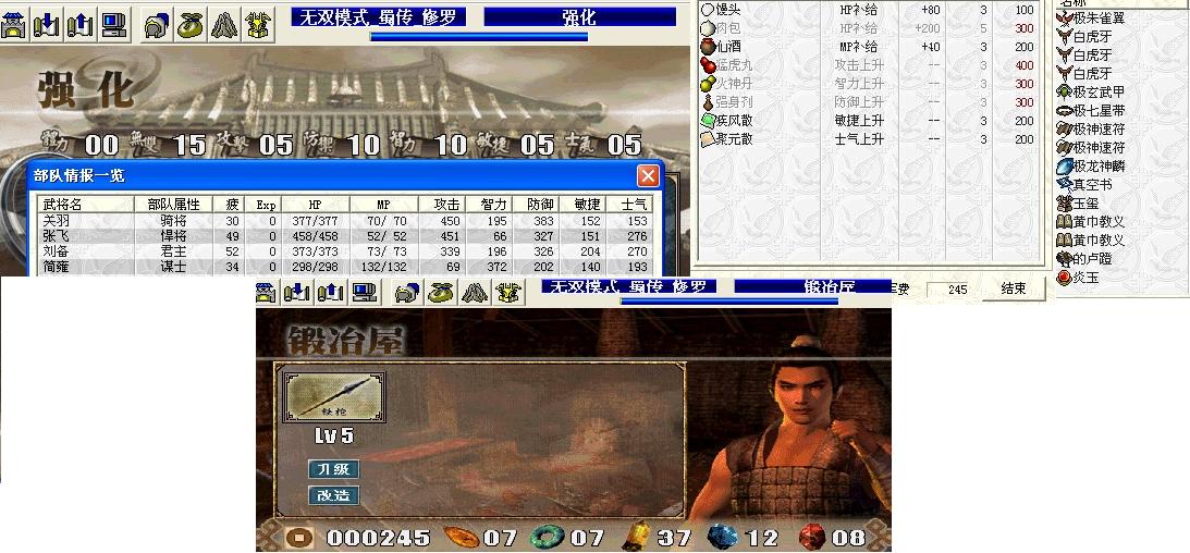 出战人物:刘备(铁铠3,铁剑3,道具玄武甲,兵营里强化4次攻击,3400两买包子 馒头 仙酒各5个,1个猛虎)