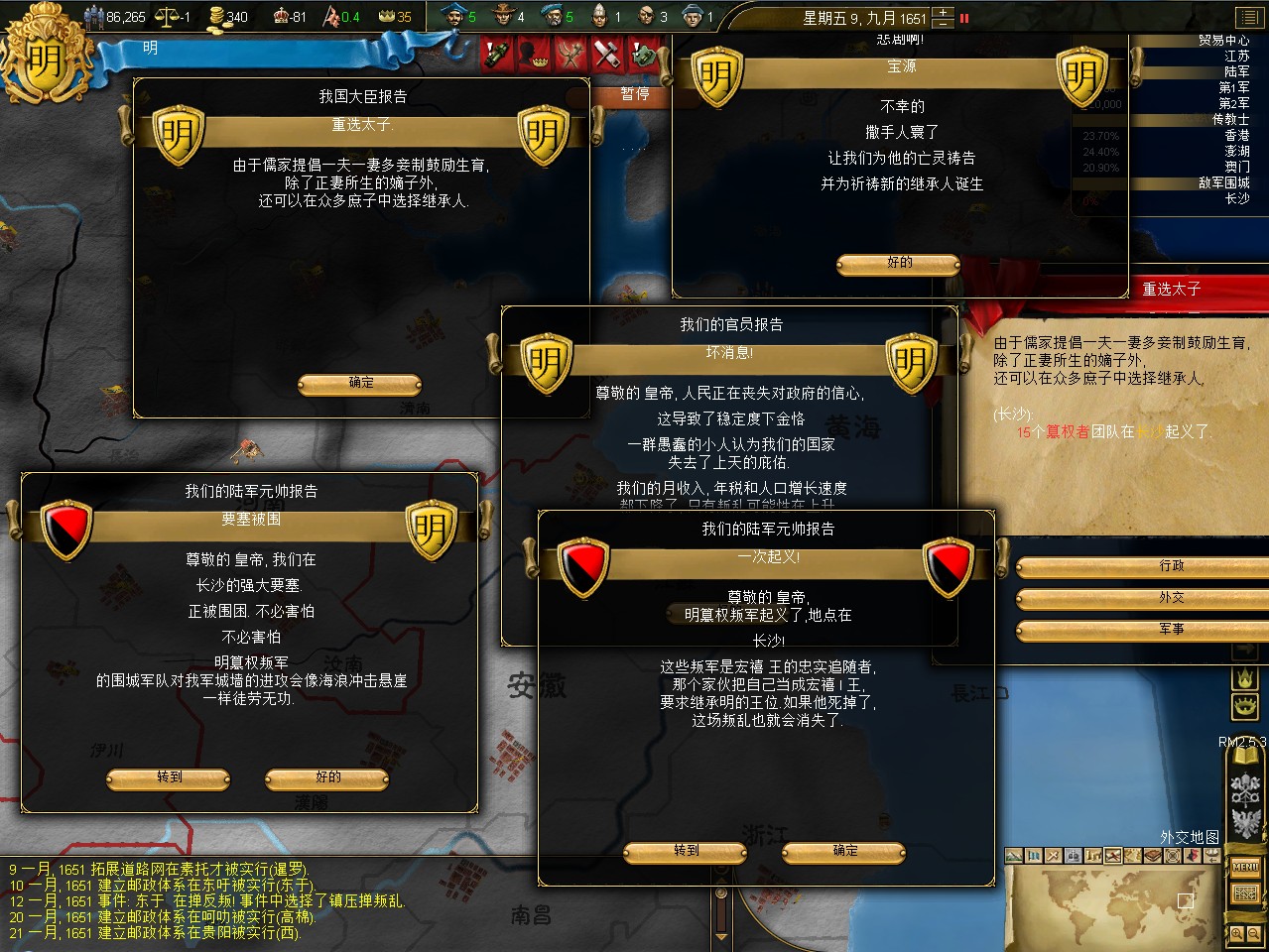 常例开局。话说三个南明剧本 1645 1652 1659,都相当BT。尤其是1659剧本,基本是不可能的任务嘛。1645剧本和1652剧本比较,1652剧本把张献忠的地吞了,兵略多些,还有个BT的李定国,但是1652剧本的南明有两个致命的弱点。一是东面被建奴占了一大片领土,这让我军无法迅速的以最小的代价来与建奴议和。二是江苏丢了,没有了江苏,经济上此消彼长,相当头痛。