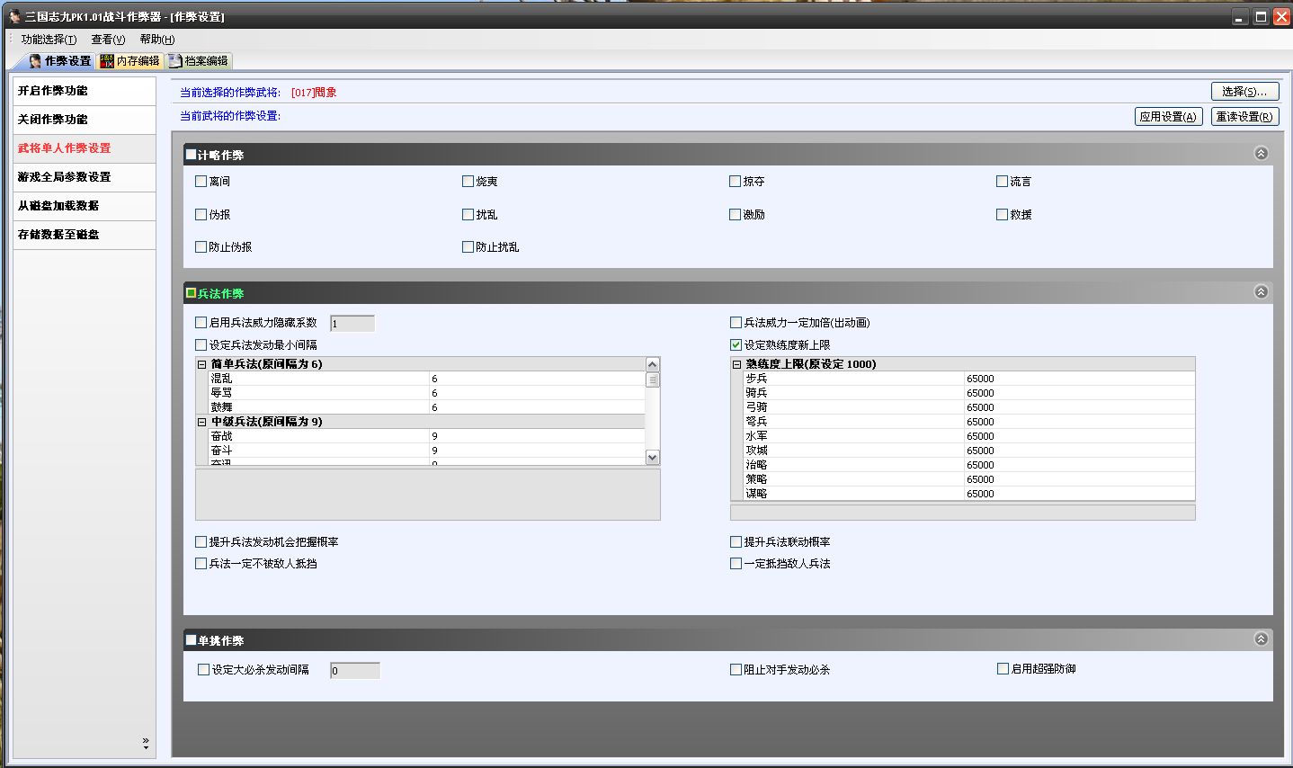 这几天天太热,做什么都没兴趣!于是把三国志九拿来玩,下了广公和风舞渊的几个剧本,但每个剧本人设都有些不同。原来使用1.2版的作弊器时只是把名将名臣的兵法熟练度上限设置了。但玩其他的剧本就会发现别人剧本的大部分名将的兵法熟练度还是没变,原因是因为大侠们做剧本时直接把一些废材替换成名将了。比如广公把袁遗替换成了项籍。于是就做了一个全部武将65000兵法熟练度补丁!该补丁要配合SanIXPKCheat 1.2——即1.2版的作弊器使用!