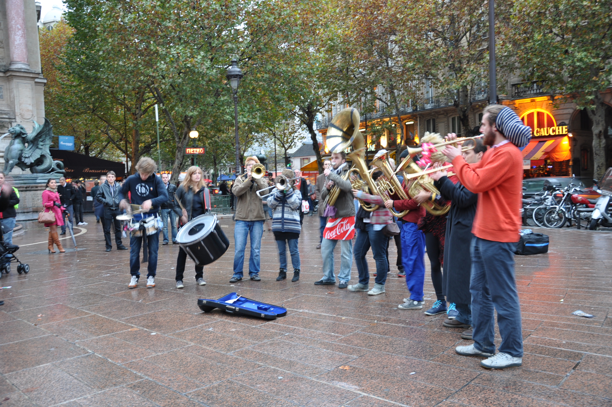 因为拖着大箱子,不想换乘RER爬上爬下,所以和LP在机场直接坐法航大巴在里昂火车站下车,再换乘地铁去旅店放下行李。因为是周日早上,出地铁时在街上根本没几个人,拖着箱子转了几圈才找到人问路,原来旅店近在咫尺,走了不少冤枉路。去旅店放下行李后马上按计划坐地铁转RER直奔凡尔赛宫,该线在巴黎市内一直沿着塞纳河边走,一路上看了不少河岸风光。巴黎天气已经比较冷,市内是阴天,我们到凡尔赛站下车时天上已经下起了不大不小的雨,还有点小风刮着。我们先去一人一个三明治填了肚子,然后直奔凡尔赛宫。