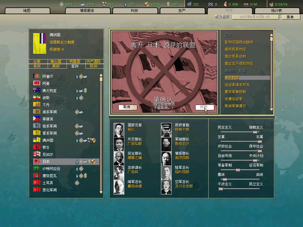 言归正传,傀儡国没法玩,所以开局先进日本放弃了对满洲国的傀儡权,然后进满洲国开玩,设置如下: