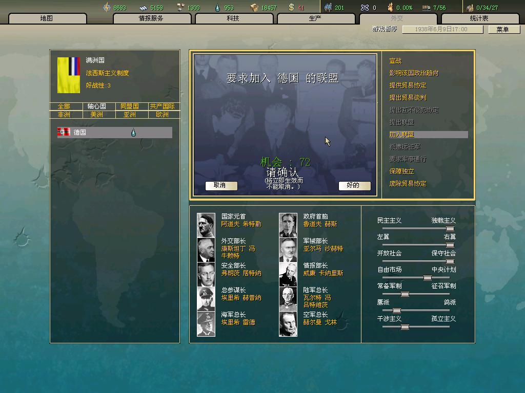 在大满洲帝国皇帝个人魅力的作用下,大德意志国与大满洲帝国结成军事同盟,成为第一个加入轴心国的法西斯国家。
