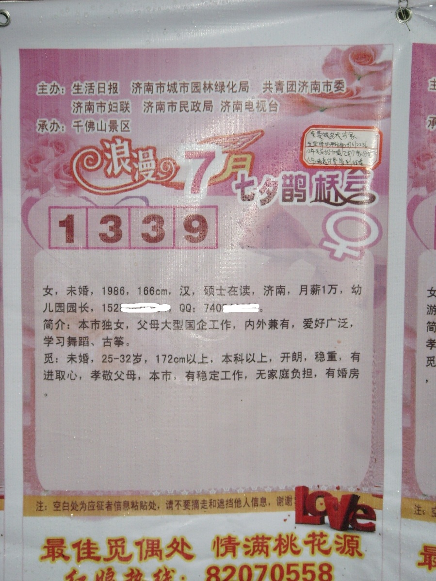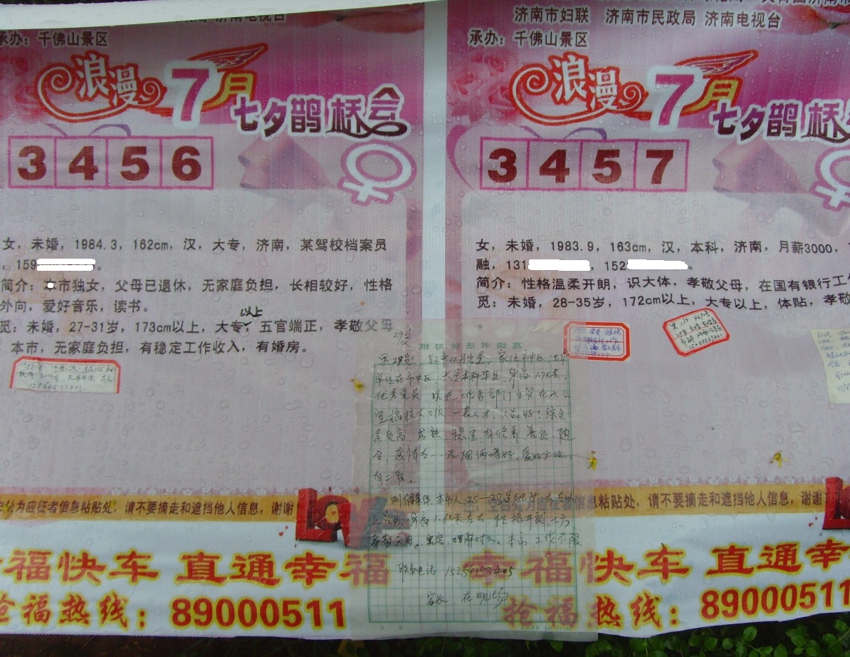 好的方面就不多说了,这次七夕相亲会要说最可气的就是千佛山公园和生活日报和移动公司之间的利益勾结了。以往相亲会信息都会刊登在生活日报上,而这次马路上卖的生活日报只刊登了少数人的征婚信息,而绝大多数征婚会员的资料则撰写在了一份生活日报相亲会专刊上面。这份专刊只在公园内出售,逼着一部分没报名的人要进门买票再买报纸,而生活日报更可气,这份专刊一份高达10元钱,这么贵不说,会员资料里还没有联系方式,还要满山上对号寻找,真气杀人也。