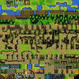 这个截图是一个256×256的图像文件。我们知道每个小格是16×16大小,所以这个BMP文件包含了所有的256种地形显示,分成16行16列。第一行从左到右是代码00-0F的图像,第二行是10-1F的图像,依此类推。例如A9就是第11行第10列的图像(一个悬崖)。