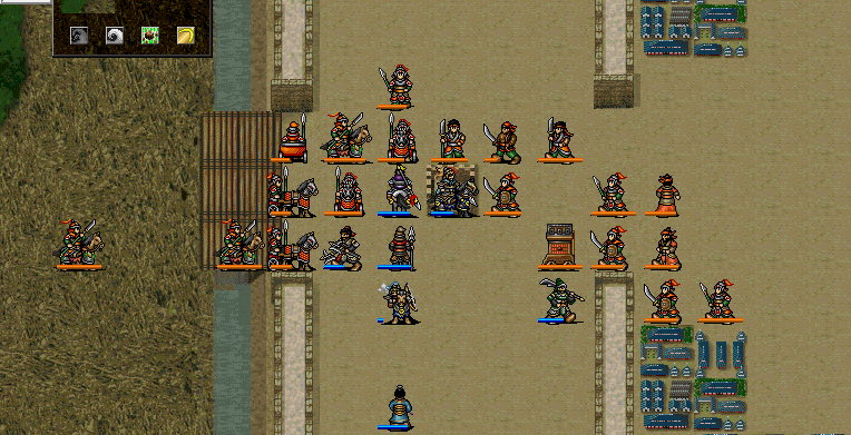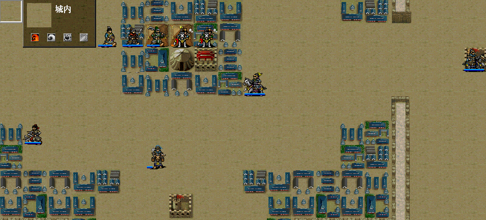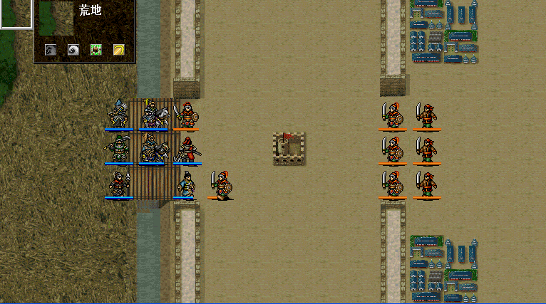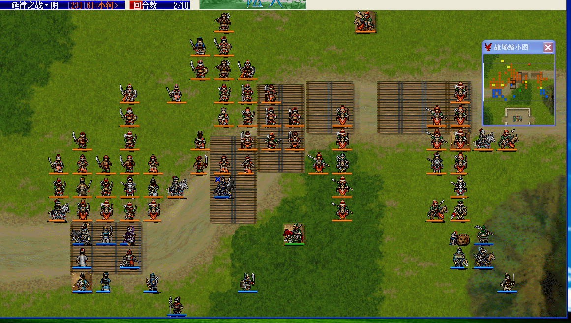 上路弓兵被郭图加过好多次血了,不要紧,实在不行后面李典出城一刀一个,给他们加血总比给步兵加血强,这关比较特殊,弓兵是能被反击的。徐晃曹洪收掉那个武术家,曹操往下走一步撑大圈子。