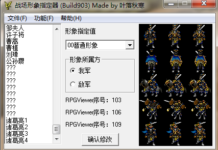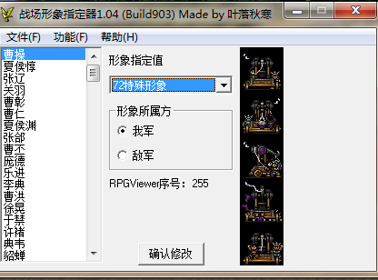 3:用了叶落秋寒的战场形象指定器指定人物形象,也按照置顶的帖子改了EXE形象地址5E7E-5E7F处的AD 00,改为00 02,可是战场形象指定器还是只能指定255个人物形象,255以后的人物形象都看不到,实际在S剧本也没有起到作用,不知道是哪里出的问题,如下图