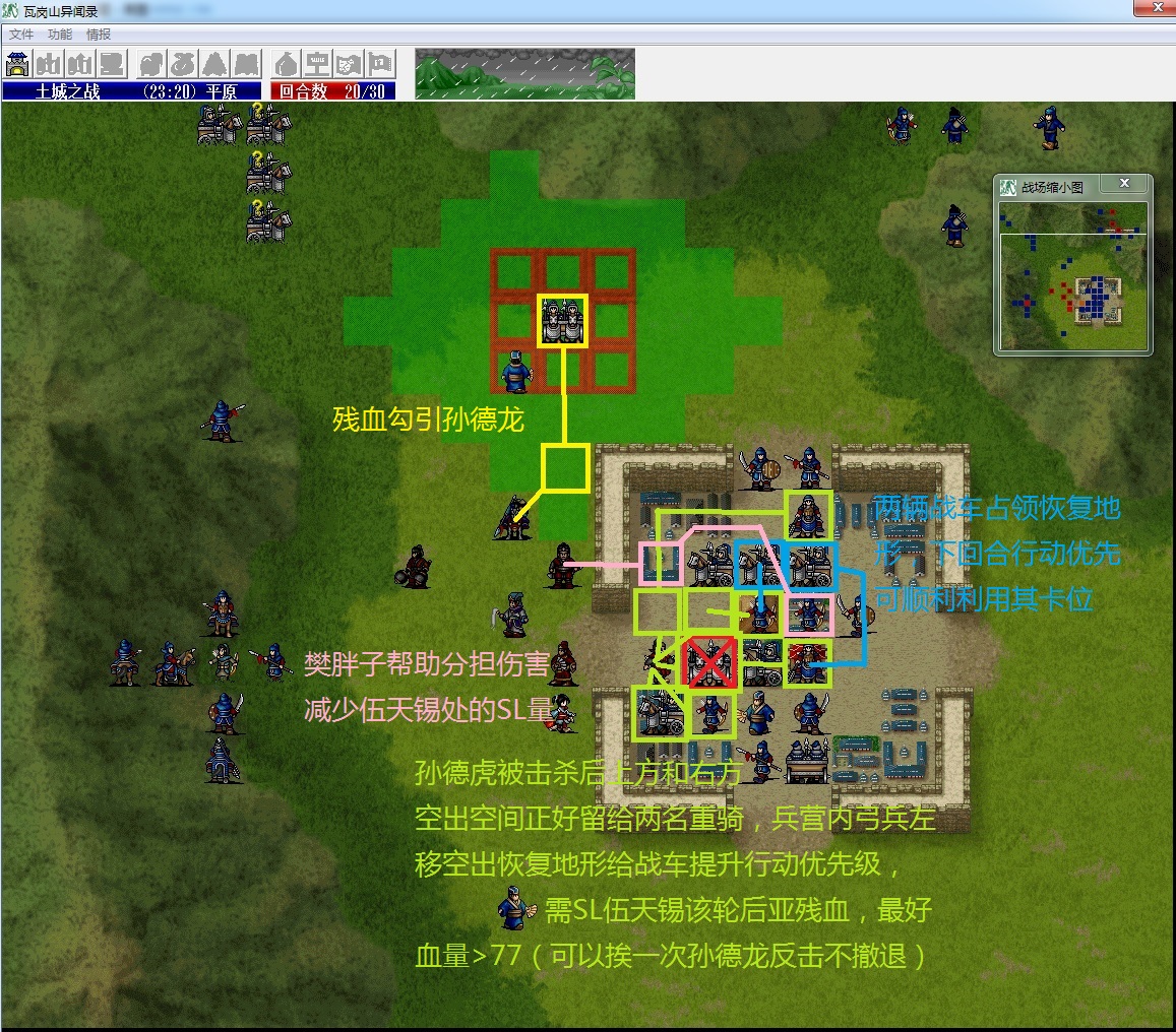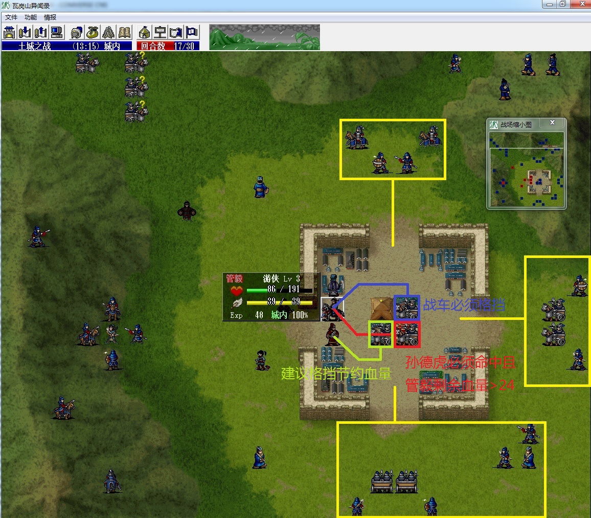 (3)管毅血量蹭到85~87(87是孙德虎站在120%地形能秒杀管毅的血线,不建议低于85,因为孙德虎实际伤害浮动在58~64,而弓兵在城内攻击管毅的面板伤害是24,留一点SL余地比较好)。