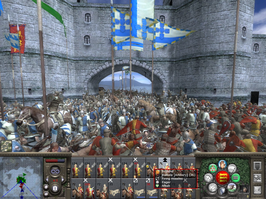 简要说一下:作战时左下角就是雷达地图。其中红色代表敌,蓝色代表我。星状代表将军所在,其他部队可以根据其箭头的朝向了解到其行动或面对的方向。在雷达地图的右边有个长条,是战力对比与胜败估计,战斗时鼠标移上去之后才会有所显示。红色越多表示在战场形势越有利于我方,可以看与威尼斯的米兰之战中几张图那个红条的变化,与法国的也是。很可惜的是与拜占庭那仗对手倒是很强,只是因为全神贯注于战斗,等到快结束的时候才想起来截图,于是截到了几张追击图……