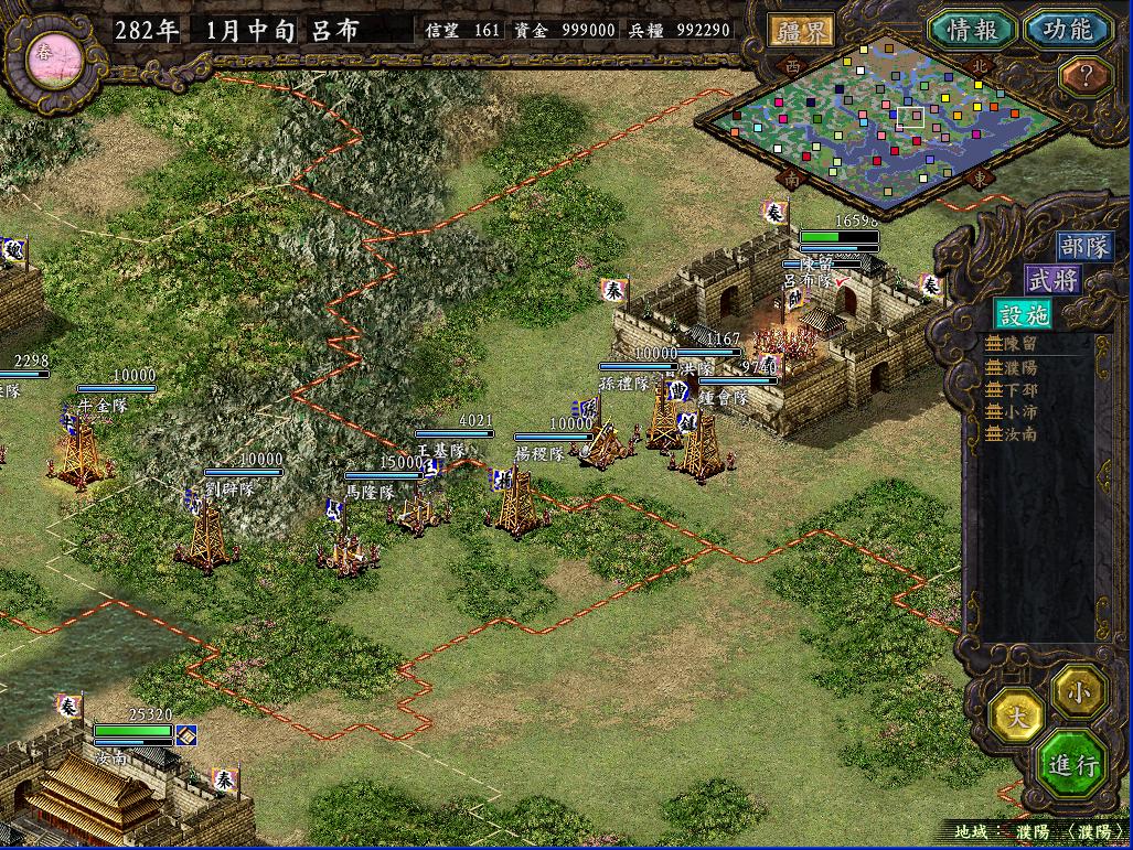 而曹操反复无常,尽出8万人马强攻陈留,吕布自引15000兵马出城迎敌,缓住对方攻城兵器的脚步,另一方面张虎,曹性火速从小沛,下邳救援。而吕布两个2联动突击,唐恒一个3联动突击,高顺一个突击在加上宋宪的三联动突进共歼敌近4W人。但是曹军毕竟强大,连连发动骑射,幸亏刚加入的张勋领15000援军在城内仅剩下300人时到达陈留,才避免了城破。此时北海孔融又来进攻防守薄弱的下邳,多亏了北平公孙瓒的王门,严纲围攻北海,才解了下邳之围。黄巾军又攻濮阳,不过曹军的攻城部队多被歼灭,使得吕布得以支援濮阳,留下高顺的15000人马追击曹军还有城内的5000人马守城。谁知袁绍帮我解了围:出兵5W攻打平原,而曹操还不死心,再领3W5K攻打陈留。结果可想而知,吕布四联动突击直接秒杀曹操队,杀敌19652!